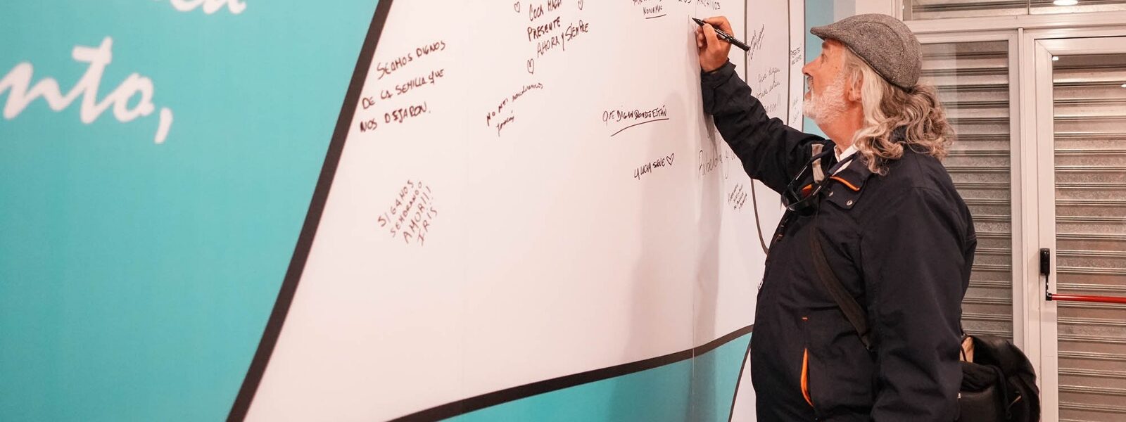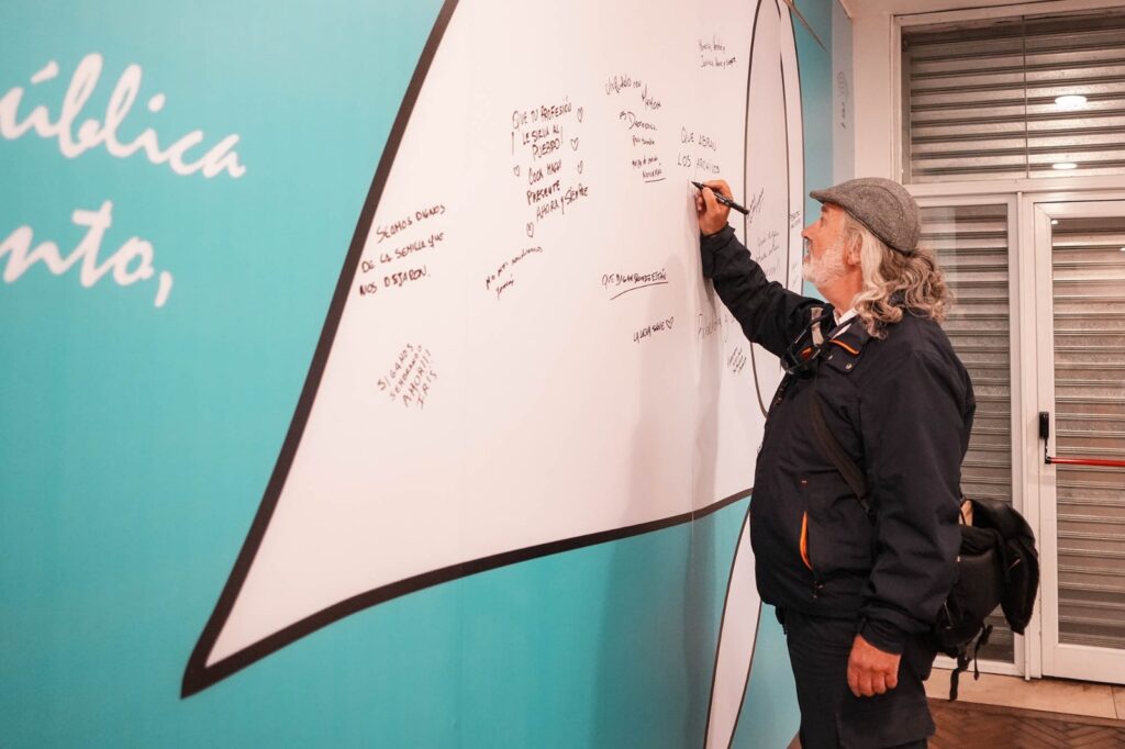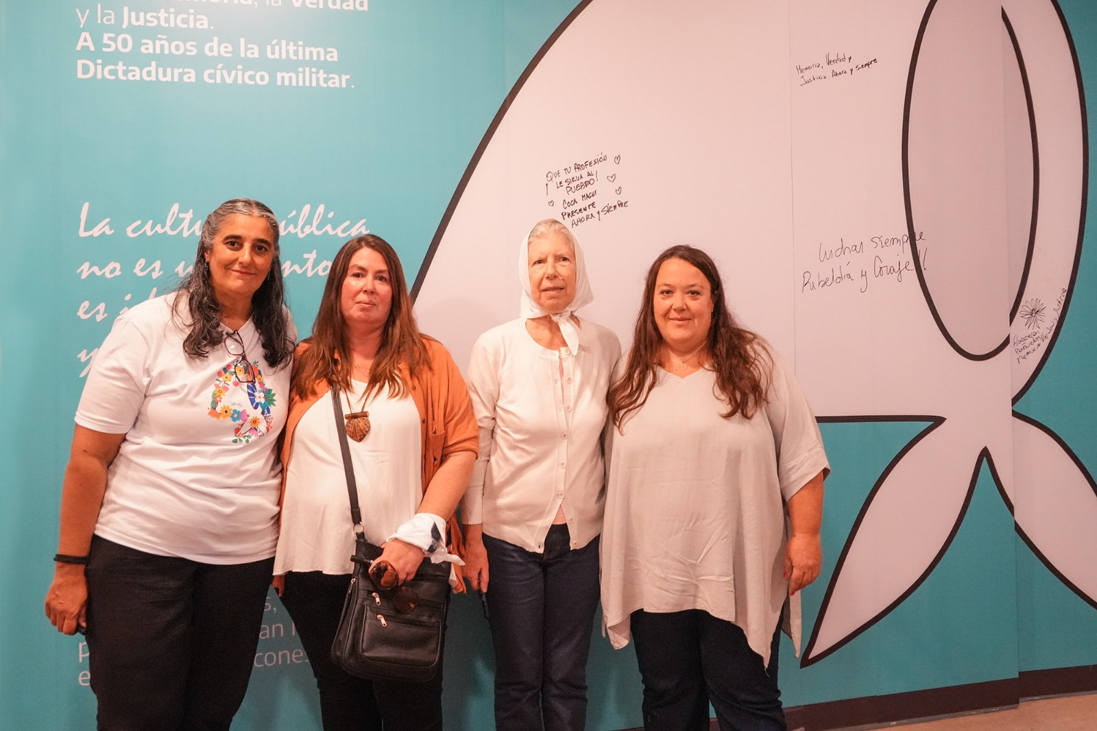 Asimismo el público participó interviniendo con mensajes la gigantografía de un gran pañuelo blanco, símbolo de la lucha de Madres y Abuelas de Plaza de Mayo con mensajes. Está acción dio comienzo con la participación de Guillermina Tonetti trabajadora del Teatro Auditorium y familiar directo de María del Carmen “Coca” Maggi (docente y decana universitaria secuestrada y asesinada), junto a Eduardo nachman (Hijo de Gregorio Nachman), Madres, Abuelas y nietas y nietos recuperados.