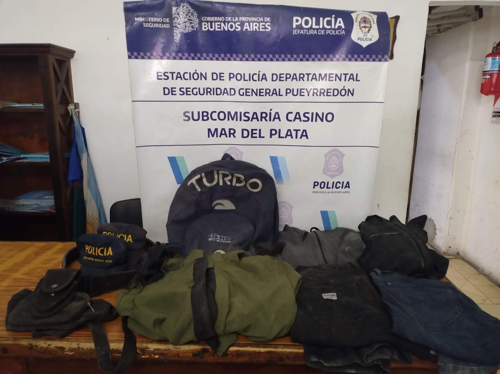 La irrupción arrojó resultado positivo. Se procedió al secuestro de una mochila azul con inscripción “TURBO”, prendas de vestir varias —campera negra, pantalón oscuro y camperón negro/verde—, dos gorras con insignia policial, un correaje policial y un porta esposas. Por el hallazgo de los elementos con insignias policiales se iniciaron actuaciones por separado bajo la carátula de Averiguación de Ilícito.