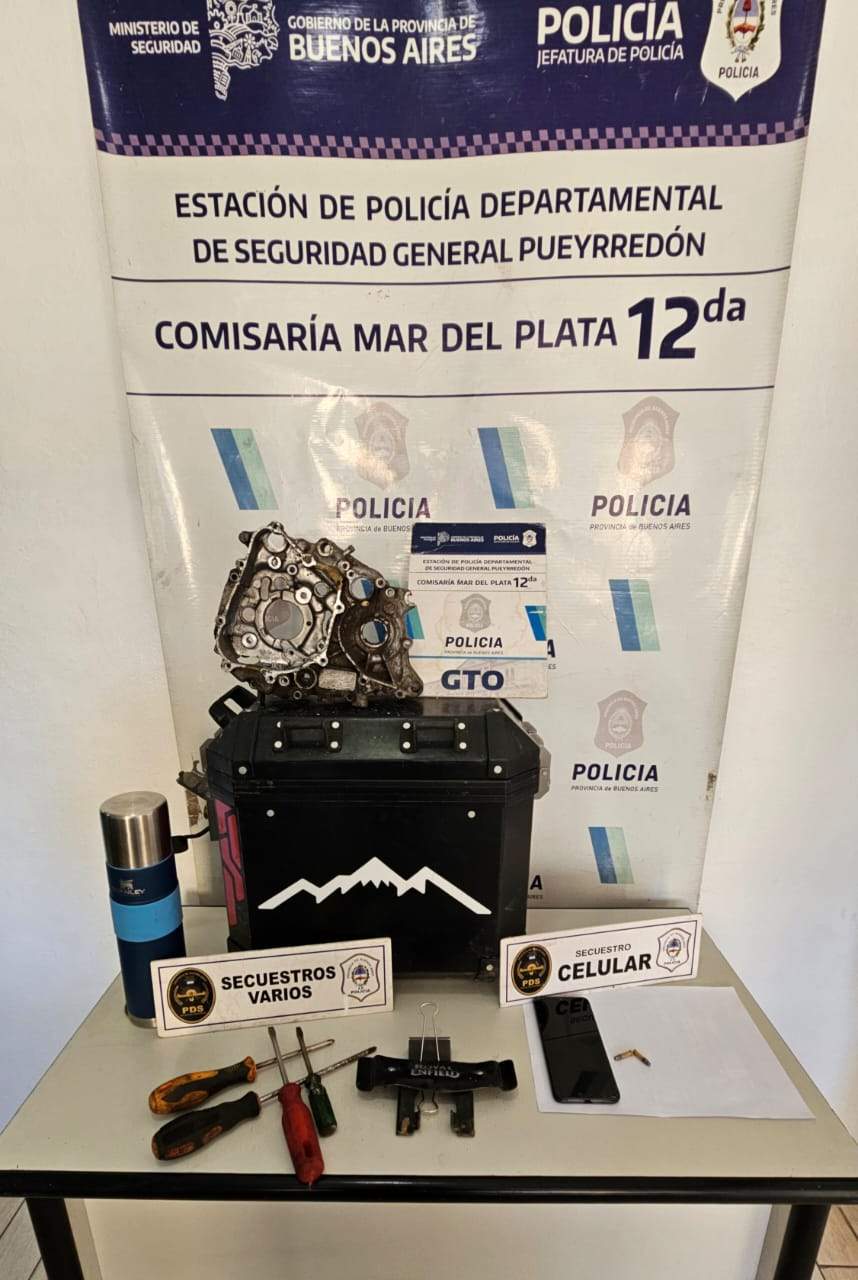 En el lugar fueron identificados una mujer y un hombre, ambos de 26 años, y se secuestraron diversos elementos de interés: un teléfono Motorola con pantalla astillada, un termo color verde agua marca Stanley, cuatro destornilladores de distintos tamaños, una tapa de motor con numeración suprimida, un porta patente sin dominio con inscripción “Royal Enfield” y una alforja tipo baulera negra con logo “Himalaya”.