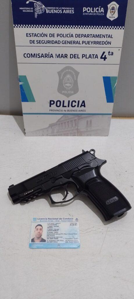 Al ser interceptado por el personal policial, se negó a aportar datos filiatorios y se constató en el interior del rodado un objeto similar a un arma de fuego, determinándose posteriormente que se trataba de un arma de utilería tipo gas comprimido.