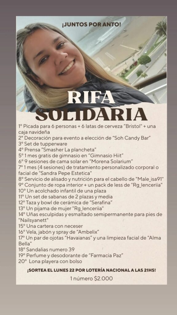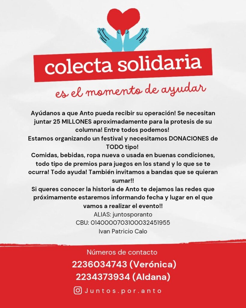 Quienes deseen colaborar pueden hacerlo a través del alias «juntosporanto» a nombre de Iván Patricio Calo o contactándose al Instagram @juntos.por.anto .