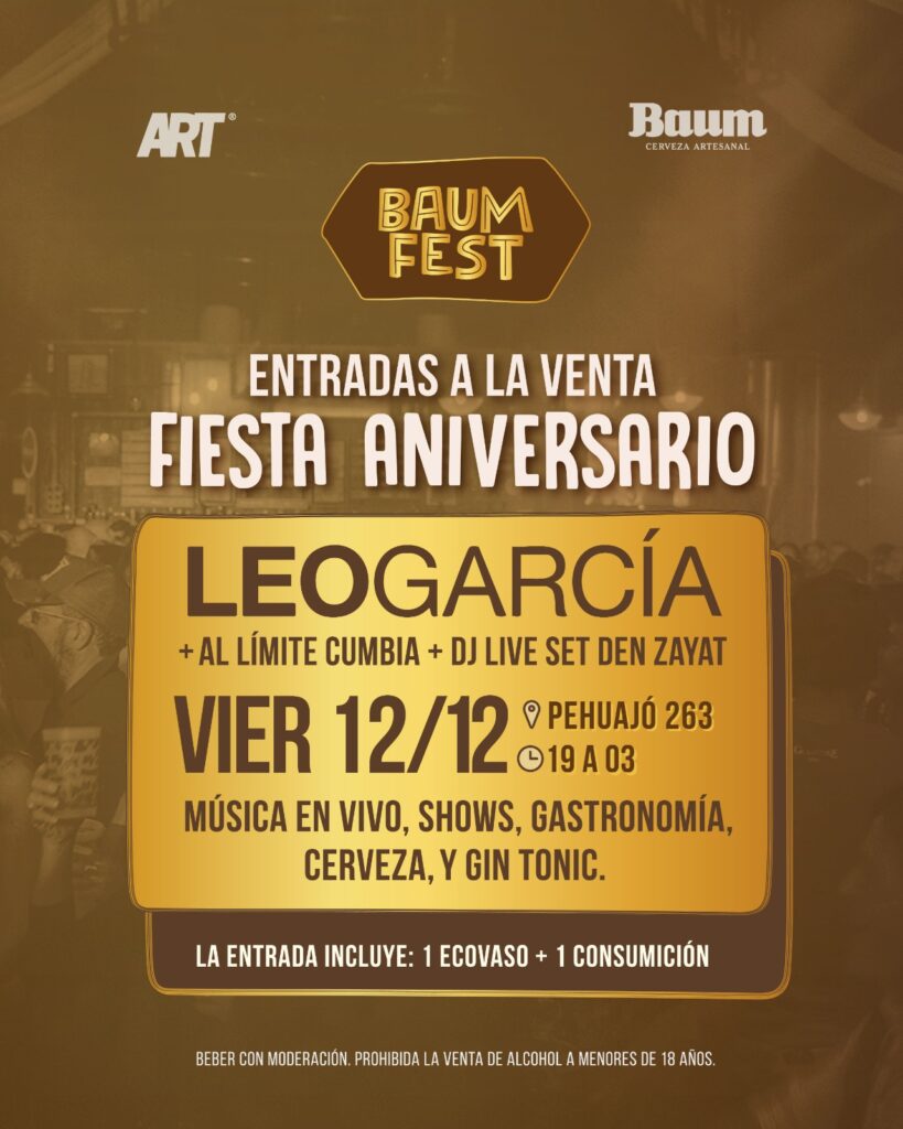 Las entradas ya están a la venta en Articket e incluyen un ecovaso más consumición a través del link https://articket.com.ar/BAUM-ANIVERSARIO/ o en la bio de @cervezabaum en Instagram.