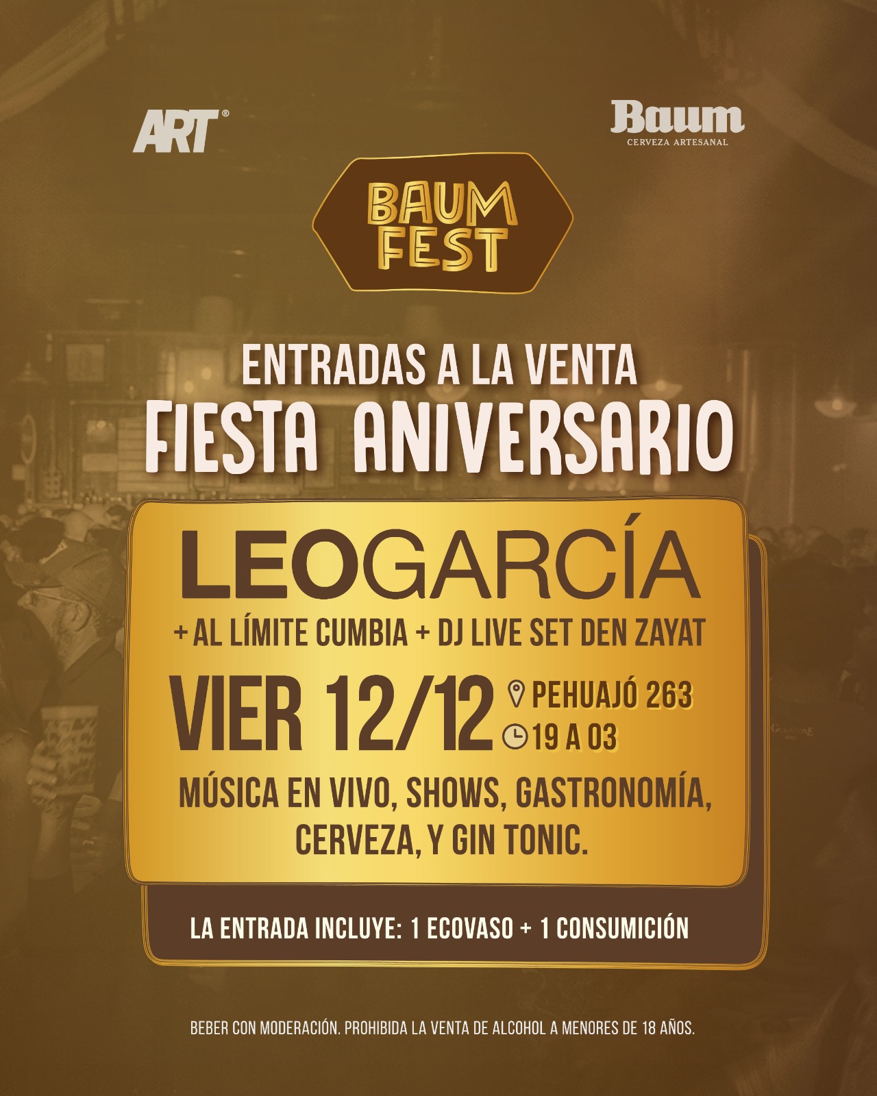 Las entradas ya están a la venta en Articket e incluyen un ecovaso más consumición a través del link https://articket.com.ar/BAUM-ANIVERSARIO/ o en la bio de @cervezabaum en Instagram.