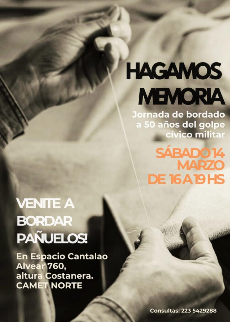 La convocatoria invita a la comunidad a unirse para bordar en retazos de tela clara, uniendo puntadas, voces y repensando en círculo. «Recordando lo imposible de olvidar. Trayendo historias, dando testimonio», expresan los organizadores.