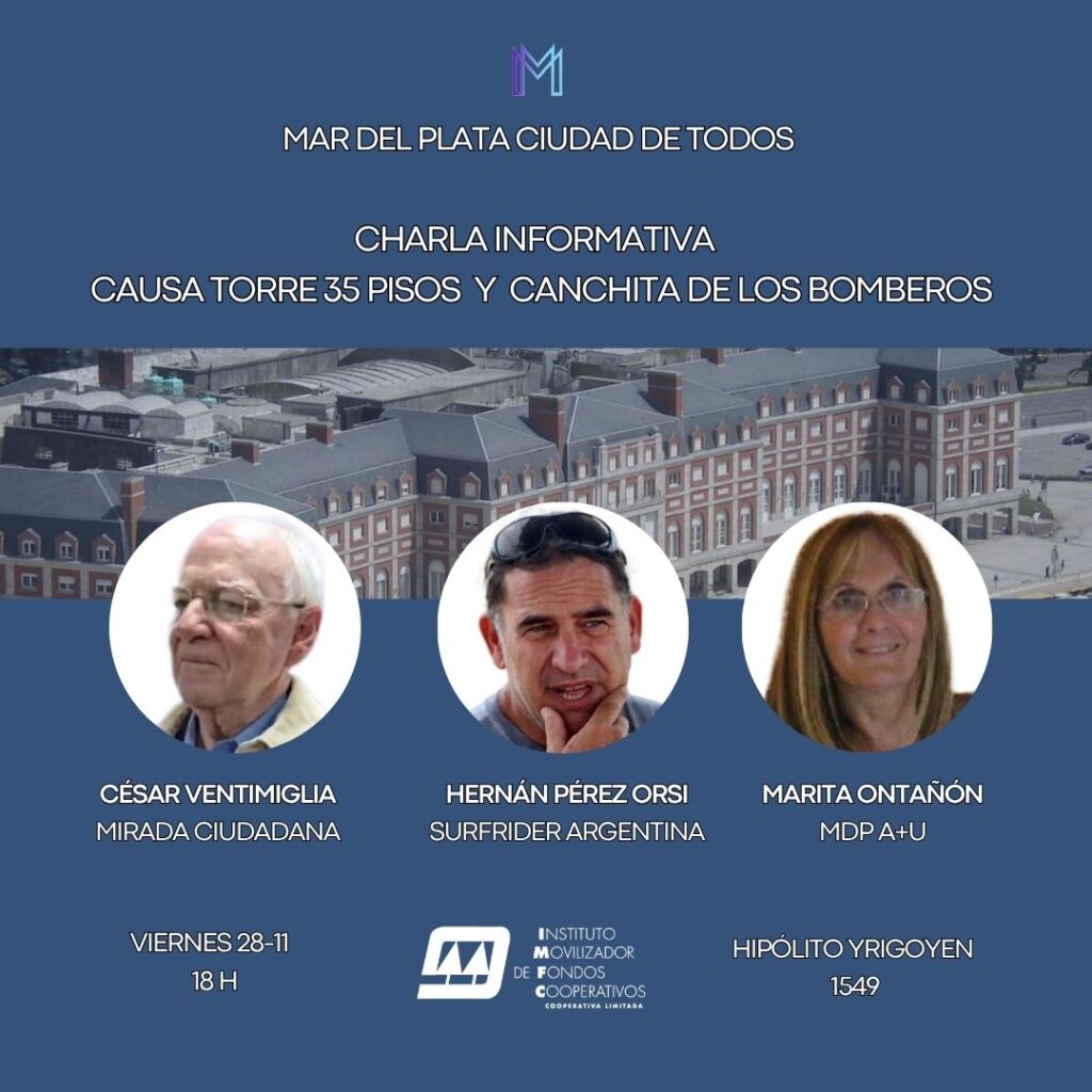 El viernes 28 de noviembre a las 18 en el Instituto Movilizador de Fondos Cooperativos, Hipólito Yrigoyen 1549, MAR DEL PLATA CIUDAD DE TODOS organiza una Charla Informativa para abordar novedades sobre la Causa contra la construcción de la Torre de 35 pisos en Varese, y la situación de la Canchita de los Bomberos.