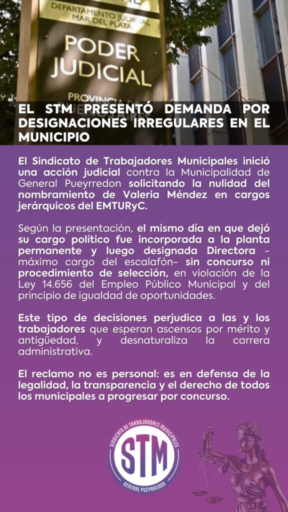 El Sindicato de Trabajadores Municipales de General Pueyrredon promovió una demanda contencioso administrativa contra la Municipalidad solicitando la nulidad de los decretos que dispusieron el nombramiento de la Sra. Valeria Méndez en cargos de planta permanente y jerárquicos dentro del Ente Municipal de Turismo y Cultura (EMTURyC).