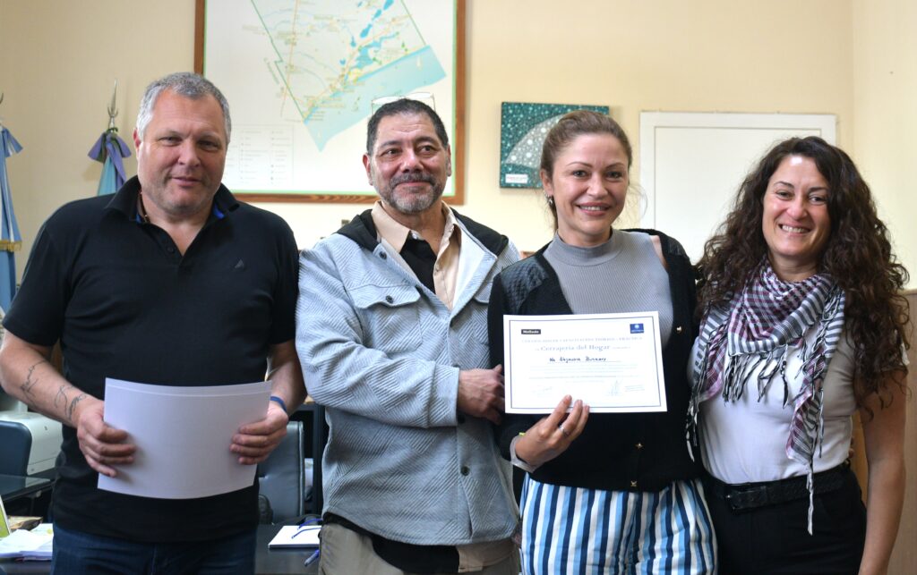 Durante la entrega de certificados que se llevó adelante en el Palacio Comunal, Fabián Jacquet; Vanina Calvo y Javier Giraldez, coordinador del taller, le entregaron a Julio Mellado un reconocimiento por el compromiso y la entrega con la comunidad.