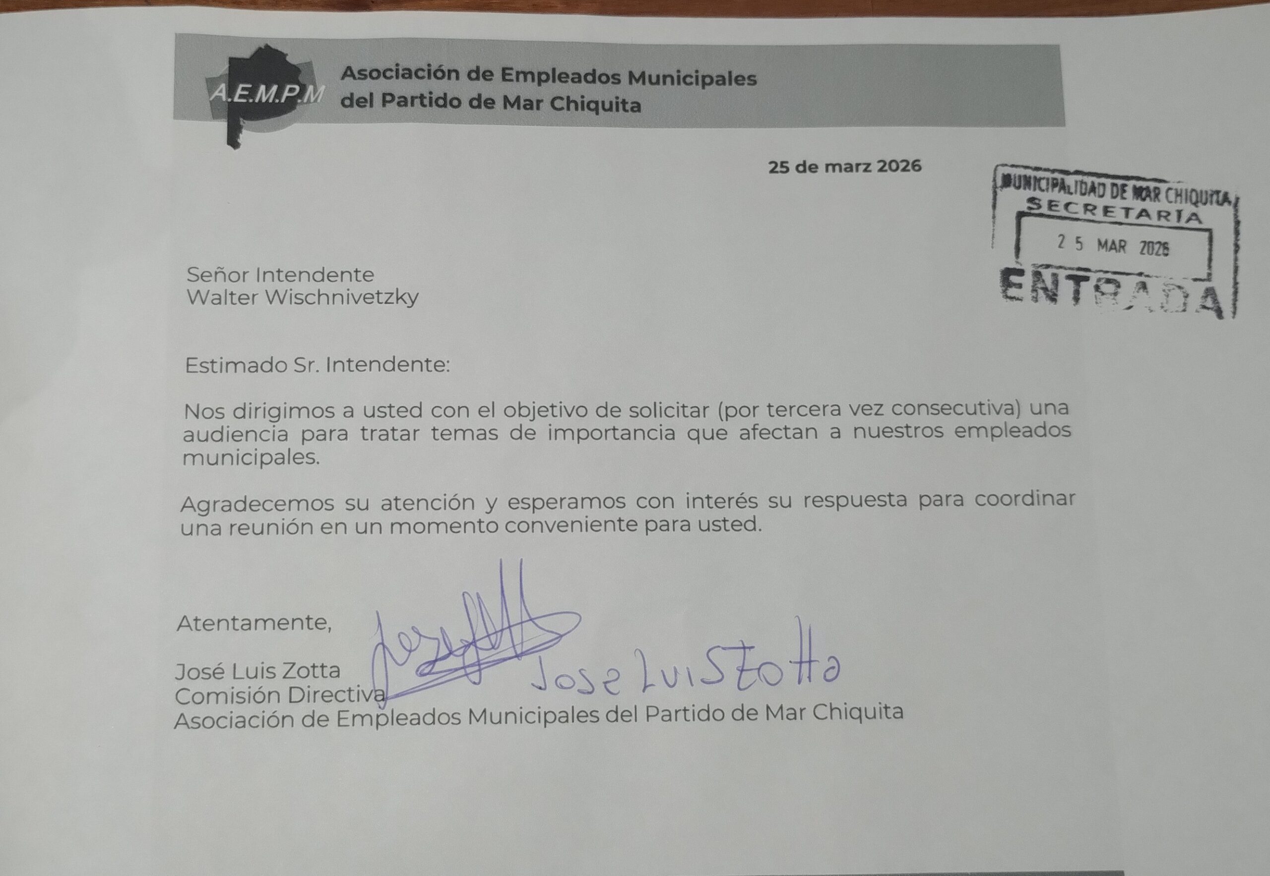 La Asociación de Empleados Municipales del Partido de Mar Chiquita (AEMPM) solicitó por tercera vez consecutiva una audiencia con el intendente Walter Wischnivetzky para tratar temas de importancia que afectan a los trabajadores municipales.