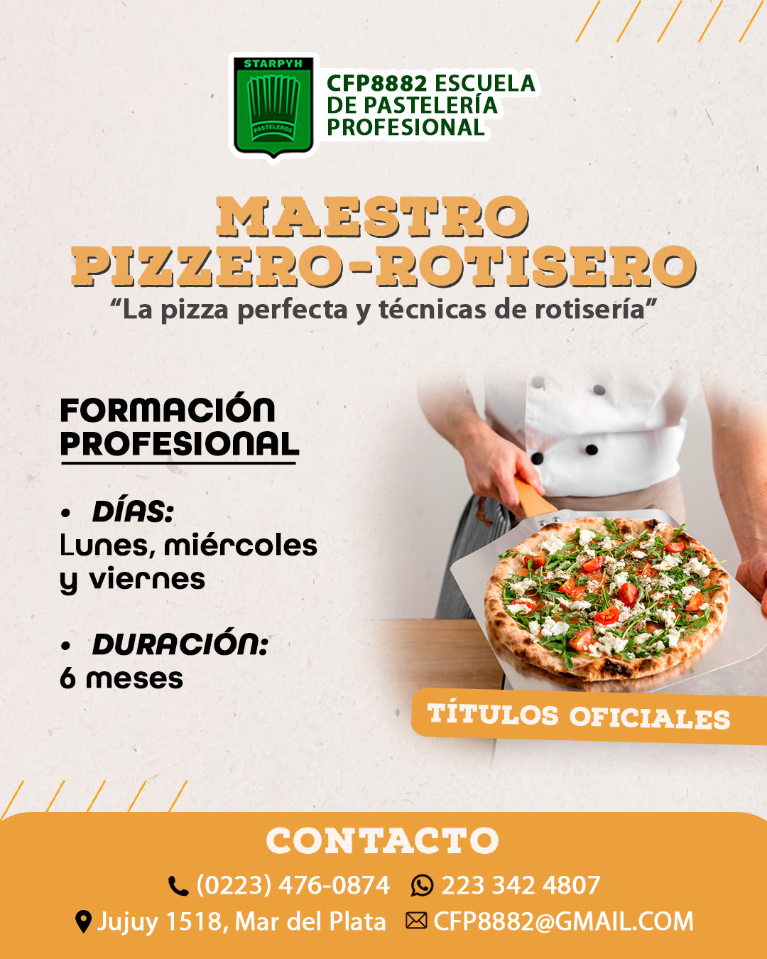 También se encuentra abierta la inscripción para el Trayecto de Maestro Pizzero-Rotisero, una capacitación intensiva de seis meses de duración, con certificación oficial.