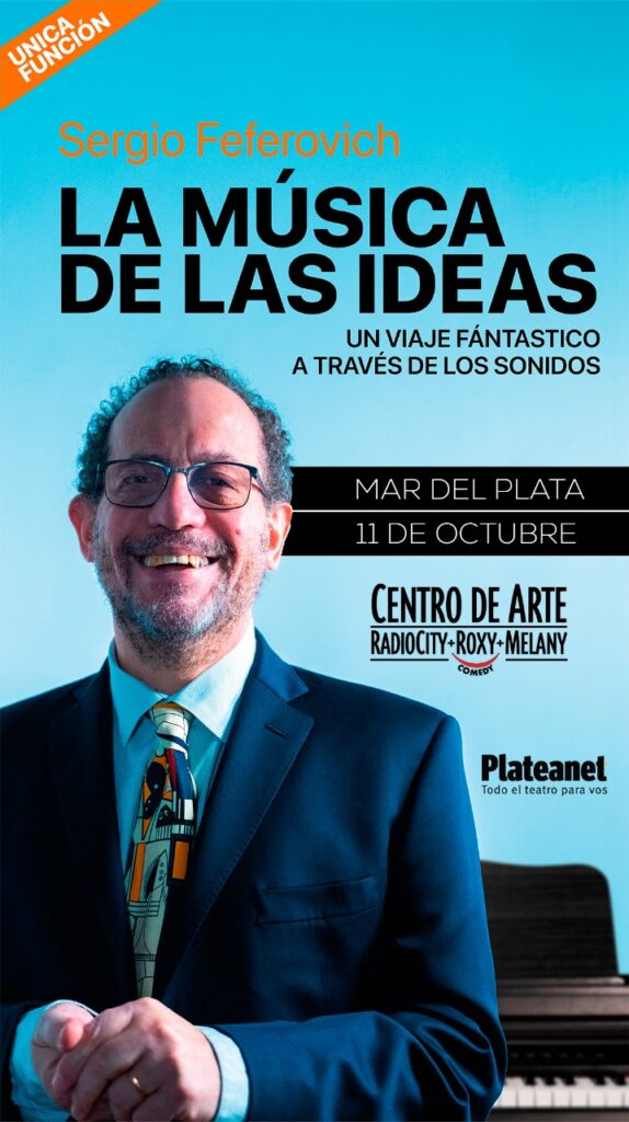 Sergio Feferovich, Doctor en Música por la Universidad Johns Hopkins, se presentará el sábado 11 de octubre a las 20:30 hs en el Centro de Arte Radio City Roxy para responder a la pregunta ¿puede la música ser una fuente de inspiración para generar ideas?. Las entradas se pueden adquirir en boletería del Teatro y por Plateanet.