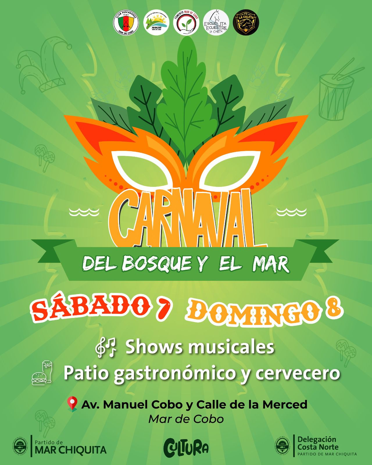 La Delegación de Costa Norte, a cargo de Andrea Lezcano confirmó la fecha del Carnaval del Bosque y el Mar, que se celebrará el sábado 7 y domingo 8 en la localidad de Mar de Cobo. El evento tendrá lugar en la intersección de Av. Manuel Cobo y Calle de la Merced, con propuestas culturales y recreativas abiertas a toda la comunidad.