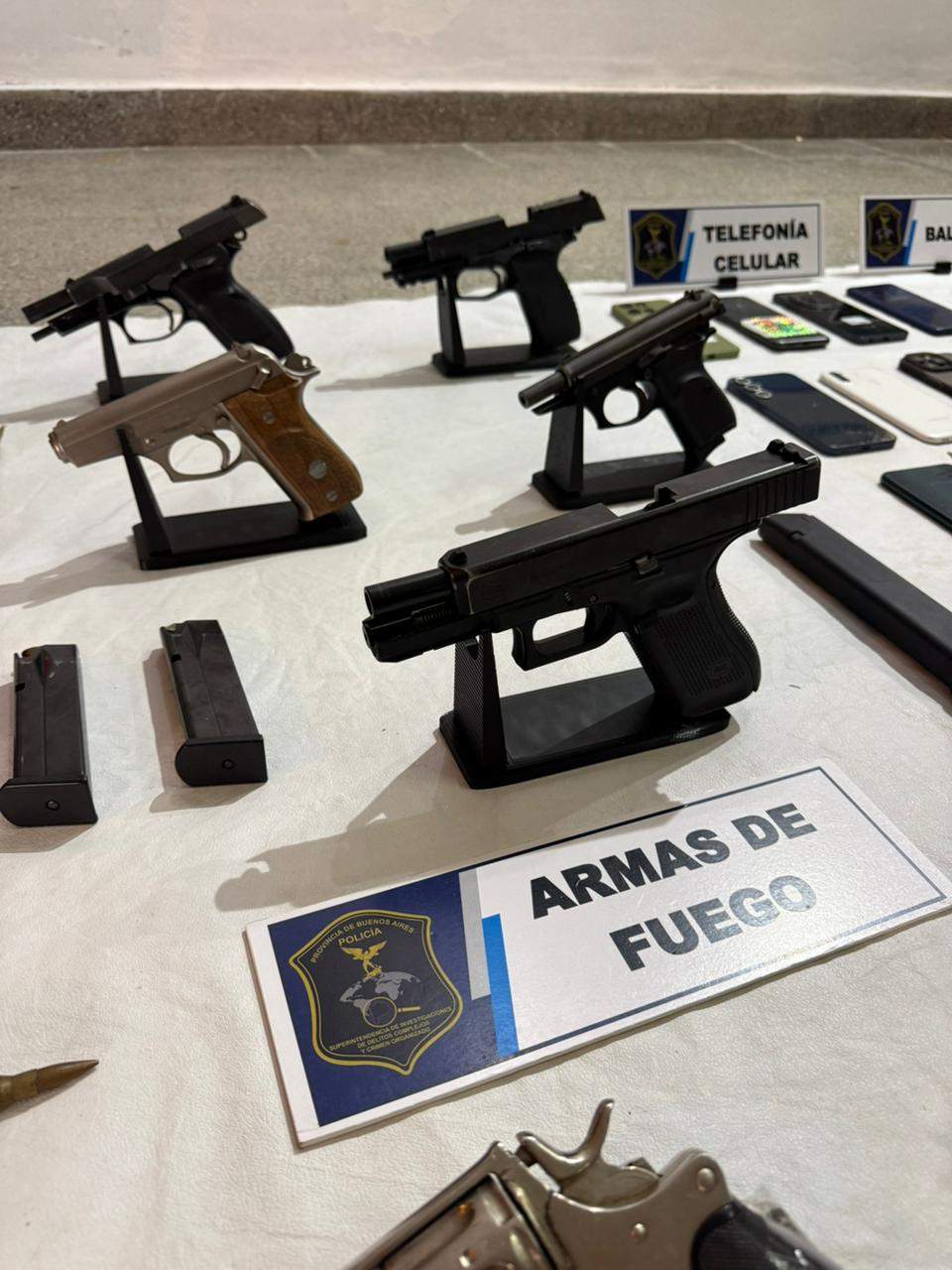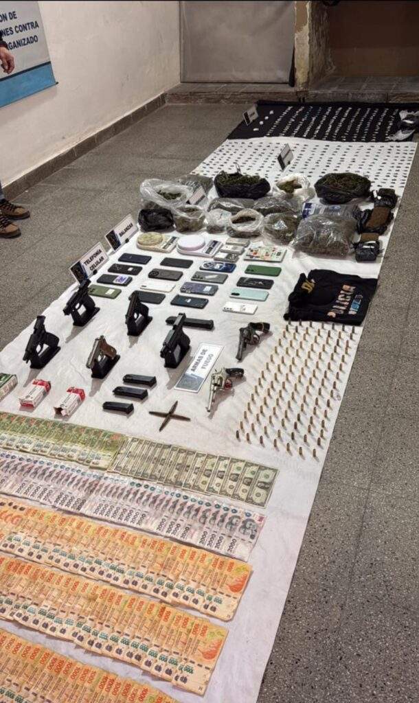 También se incautaron múltiples armas de fuego de distintos calibres, entre ellas pistolas y revólveres, varias con numeración suprimida, junto a municiones de diverso tipo.