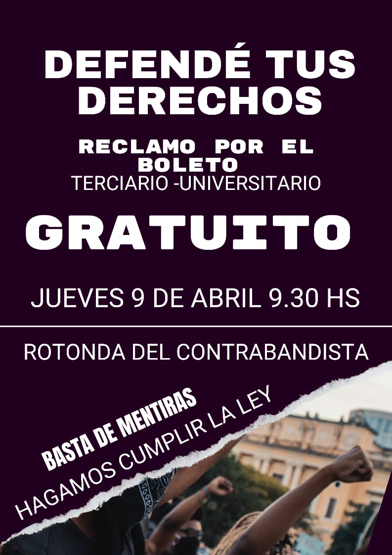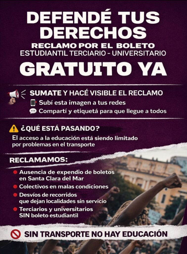 Este jueves 9 de abril, a las 9:30 hs, vecinos y estudiantes de Mar Chiquita se reunirán en la rotonda del Contrabandista de Santa Clara del Mar para exigir la implementación del Boleto Estudiantil Gratuito para niveles terciarios y universitarios. La medida se enmarca en el reclamo por el incumplimiento de la Ley 14.735, que establece la gratuidad del boleto para estudiantes de todos los niveles.